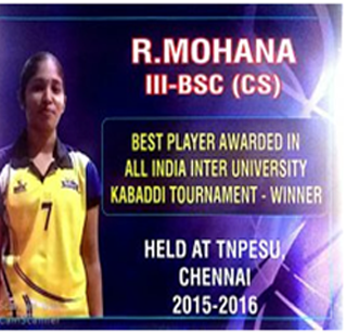 R. Mohana, an outstanding player of our college has been selected in railways department, and another student M. Gowsalya has been selected as police. R. Mohana played in Fire Birds Team in Pro Kabaddi Tournament for women 2016-17 and secured the position of Runners.